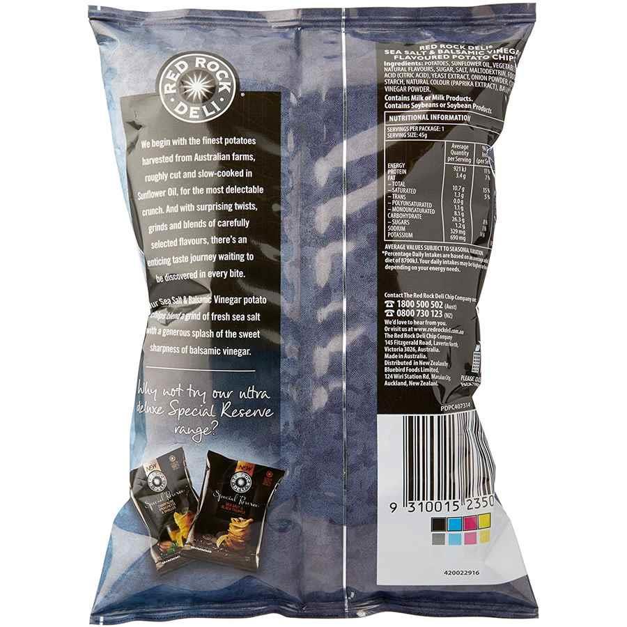 WebRed Rock Deli Potato Chips Sea Salt & Balsamic Vinegar flavoured potato chips are seasoned with a fresh grinding of sea salt, combined with sweet aged balsamic vinegar.. WebRed Rock Deli Sea Salt & Balsamic Vinegar Potato Chips 165g. Red Rock Deli's fascination for flavour begins with the finest Australian potatoes. Roughly cut and slow-cooked,. WebWhen it comes to plain chips, Smith’s are the best and the same story for salt and vinegar. These chips are just better than any others. The crinkle cut shape offers. WebChips. Whether it's for a party, movie night or snack time there's a chip for every occasion. Split a share bag with a friend or prepare the lunchbox with multipacks from all your. WebSea Salt & Vinegar Potato Chips 165g. AU $8.82. AU $11.34 + AU $9.95 postage. Picture Information. Picture 1 of 3. Click to enlarge. Hover to zoom. Have one to. WebRed Rock Deli® potato chips flavors include Lime & Cracked Pepper, Himalayan Pink Salt and Red Curry Coconut. Buy online now or find in store. Buy online now or find in store..